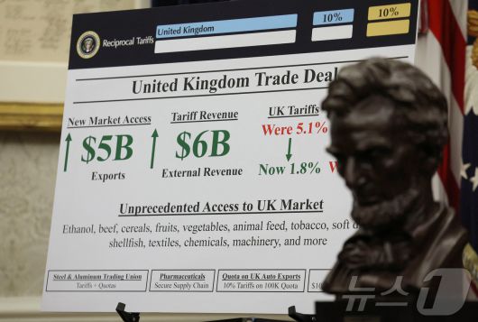 도널드 트럼프 미국 대통령이 8일(현지시간) 워싱턴DC 백악관 오벌오피스에서 영국과의 무역 협정을 발표한 가운데, 에이브러험 링컨 대통령 흉상 뒤로 관련 내용을 요약한 피켓이 보인다. ⓒ 로이터=뉴스1 ⓒ News1 류정민 특파원 |