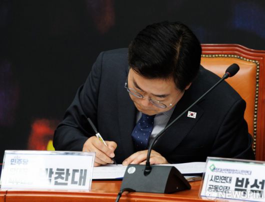 [서울=뉴스핌] 윤창빈 기자 = 박찬대 더불어민주당 대표 직무대행과 참석자들이 9일 오후 서울 여의도 국회에서 열린 광장대선연합정치시민연대-제정당 연석회의공동 선언 발표 기자회견에서 선언문에 서명을 하고 있다. 2025.05.09 pangbin@newspim.com |