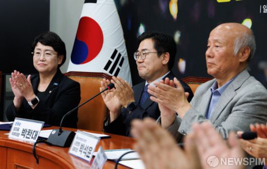 [서울=뉴스핌] 윤창빈 기자 = 박찬대 더불어민주당 대표 직무대행, 김선민 조국혁신당 대표 권한대행, 박석운 시민연대 공동의장이 9일 오후 서울 여의도 국회에서 열린 광장대선연합정치시민연대-제정당 연석회의공동 선언 발표 기자회견에 박수를 치고 있다. 2025.05.09 pangbin@newspim.com