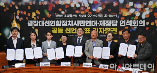 아시아투데이 송의주 기자 = 9일 국회에서 열린 광장대선연합정치시민연대·제정당 연석회의 공동 선언 발표 기자회견에서 참석자들이 공동선언문에 사인을 한 뒤 기념촬영을 하고 있다. 왼쪽부터 한창민 사회민주당 대표, 용혜인 기본소득당 대표, 김재연 진보당 대선 후보, 김선민 조국혁신당 대표 권한대행, 박찬대 더불어민주당 당대표 직무대행, 박석운·이나영·이용길·김경민 시민연대 공동의장.