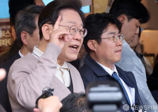 [칠곡=뉴스핌] 최지환 기자 = '골목골목 경청투어'에 나선 이재명 더불어민주당 대선후보가 9일 오후 경북 칠곡군 석적읍을 방문해 주민들 앞에서 즉흥연설을 하고 있다. 2025.05.09 choipix16@newspim.com