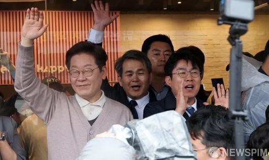 [칠곡=뉴스핌] 최지환 기자 = '골목골목 경청투어'에 나선 이재명 더불어민주당 대선후보가 9일 오후 경북 칠곡군 석적읍을 방문해 주민들 앞에서 즉흥연설을 하고 있다. 2025.05.09 choipix16@newspim.com
