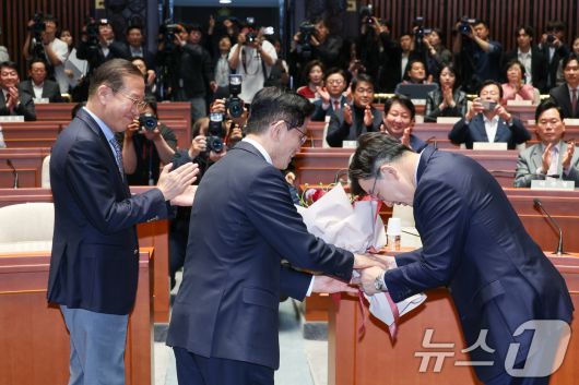 (서울=뉴스1) 안은나 기자 = 김문수 국민의힘 대통령 후보가 9일 서울 여의도 국회에서 열린 의원총회에서 꽃다발을 받고 있다. 왼쪽부터 권영세 비대위원장, 김 후보, 권성동 원내대표. 김 후보는 지도부를 향해 "무소속을 당 후보 만들려 불법부당 수단 동원, 중단하라"며 입장을 밝힌 뒤 의총장을 떠났다. 2025.5.9/뉴스1