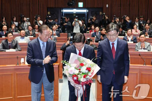 (서울=뉴스1) 안은나 기자 = 김문수 국민의힘 대통령 후보가 9일 서울 여의도 국회에서 열린 의원총회에서 꽃다발을 받은 뒤 기념 촬영하고 있다. 왼쪽부터 권영세 비대위원장, 김 후보, 권성동 원내대표. 김 후보는 지도부를 향해 "무소속을 당 후보 만들려 불법부당 수단 동원, 중단하라"며 입장을 밝힌 뒤 의총장을 떠났다. 2025.5.9/뉴스1