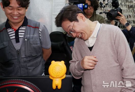 [칠곡=뉴시스] 조성우 기자 = 민심을 청취하는 '경청 투어'에 나선 이재명 더불어민주당 대선후보가 9일 경북 칠곡군 석적읍 인근 한 열쇠가게에서 한 도장가게에서 자신의 유세 모습을 실시간으로 보고 있던 상인의 모니터를 보고 활짝 웃고 있다. 2025.05.09. xconfind@newsis.com |