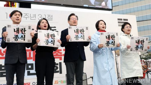 [서울=뉴스핌] 정일구 기자 = 이재명 더불어민주당 대표를 비롯한 야5당 대표들이 1일 오후 서울 종로구 안국동 사거리에서 열린 야5당 공동 내란종식·민주헌정수호를 위한 윤석열 파면 촉구 범국민대회에서 손팻말을 들고 구호를 외치고 있다. 왼쪽부터 한창민 사회민주당 대표, 용혜인 기본소득당 대표, 이재명 더불어민주당 대표, 김재연 진보당 상임대표, 김선민 조국혁신당 대표 권한대행. 2025.03.01 mironj19@newspim.com |