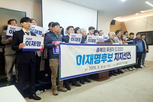 진보성향 단체 소속 20여명은 이날 충북도청 브리핑룸에서 기자회견을 열고 "이 후보를 지지하는 도민 1만명의 서명을 받았다"며 "우리는 혼란한 정국을 수습하고 미래로 나아가기 위해 이 후보의 당선까지 최선을 다하겠다"고 밝혔다.