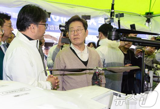 (김천=뉴스1) 이재명 기자 = 3차 경청투어에 나선 이재명 더불어민주당 대통령 후보가 9일 오후 경북 김천시 김천실내체육관 일대에서 열린 제63회 경북도민체육대회에 마련된 4차산업 체험관을 찾아 관계자에게 드론 관련 설명을 듣고 있다. 2025.5.9/뉴스1