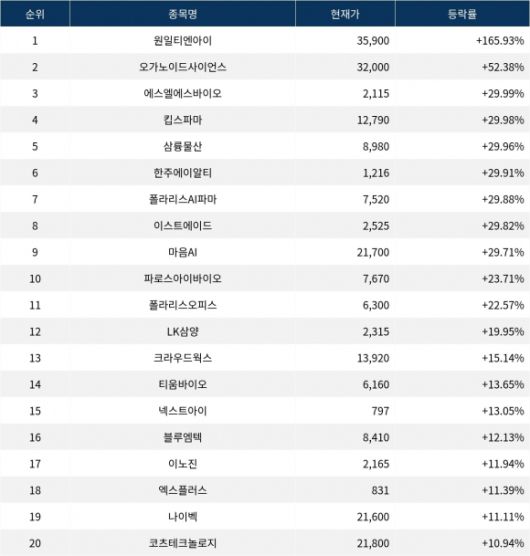 6위 한주에이알티(058450)는 종가 1,216원으로 +29.91% 상승 마감했다. 7위 폴라리스AI파마(041910)는 종가 7,520원으로 +29.88% 상승 마감했다. 8위 이스트에이드(239340)는 종가 2,525원으로 +29.82% 상승 마감했다. 9위 마음AI(377480)는 종가 21,700원으로 +29.71% 상승 마감했다. 10위 파로스아이바이오(388870)는 종가 7,670원으로 +23.71% 상승 마감했다.