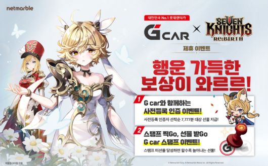 <세븐나이츠 리버스> 사전등록을 완료하고 G car 어플 내 이벤트 페이지에 접속해 인증 댓글과 기대평을 작성하면 댓글 인증 선착순 7777명에게 다양한 쿠폰을 선물한다.