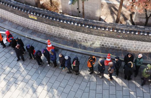 종로구 탑골공원 원각사 노인무료급식소 앞에 어르신들이 점심식사를 위해 줄지어 서 있다. (사진=연합뉴스) |