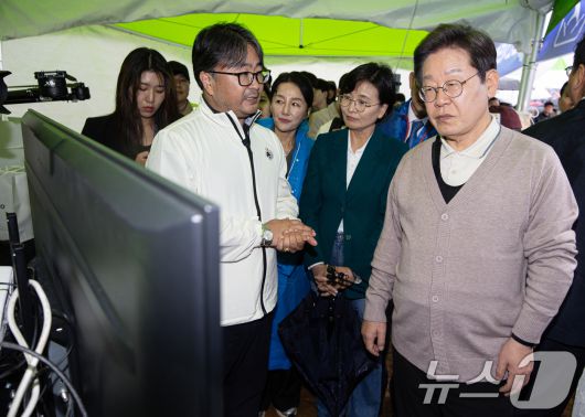 3차 경청투어에 나선 이재명 더불어민주당 대통령 후보가 9일 오후 경북 김천시 김천실내체육관 일대에서 열린 제63회 경북도민체육대회에 마련된 4차산업 체험관을 찾아 관계자에게 드론 관련 설명을 듣고 있다. 2025.5.9/뉴스1 ⓒ News1 이재명 기자 |