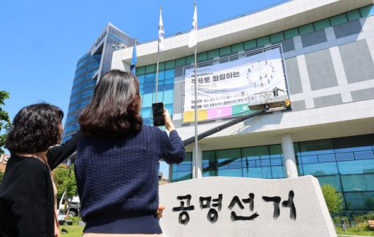 7일 인천시 미추홀구 인천시 선거관리위원회 외벽에 대선 투표일과 사전 투표일을 알리는 대형 현수막이 게시되고 있다.(사진=연합뉴스) |