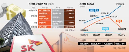 실제 SK그룹은 지난해 SK렌터카 지분 100%를 어피니티에쿼티파트너스에 8200억 원을 받고 매각했으며 SK엔펄스의 파인세라믹스 지분 100%도 한앤컴퍼니에 3600억 원에 팔았다. 또 SK이노베이션은 SK E&S를, SK온은 SK엔텀과 SK트레이딩을 각각 흡수합병하며 덩치를 키우고 재무구조를 개선했다.