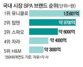 국내 시장에서 SPA 브랜드 순위는 작년 매출액 기준으로 1위 유니클로(1조601억원), 2위 탑텐(약 9700억원), 3위 스파오(약 6000억원), 4위 자라(약 4000억원), 5위 H&M(3000억원대)으로, 상위 5개 브랜드 중 3개가 해외 브랜드다. 그 뒤를 무신사스탠다드와 에잇세컨즈가 바짝 추격하고 있다. 총 10개 이상 브랜드가 치열하게 경쟁하고 있다.