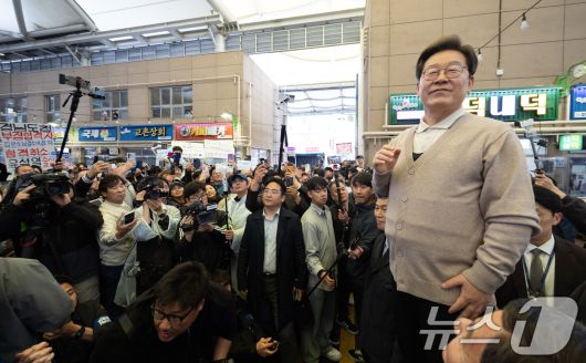 (성주=뉴스1) 이재명 기자 = 3차 경청투어에 나선 이재명 더불어민주당 대통령 후보가 9일 오후 경북 성주군 성주전통시장에서 연설을 하고 있다. 2025.5.9/뉴스1