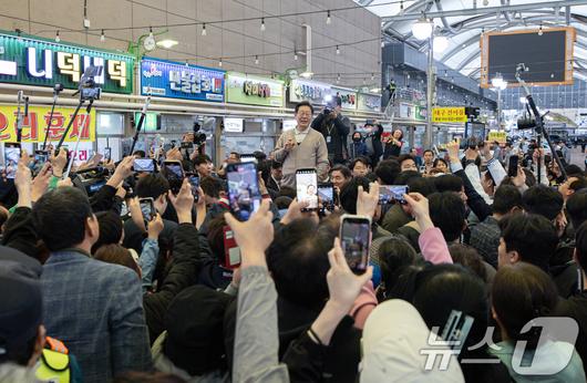 (성주=뉴스1) 이재명 기자 = 3차 경청투어에 나선 이재명 더불어민주당 대통령 후보가 9일 오후 경북 성주군 성주전통시장에서 연설을 하고 있다. 2025.5.9/뉴스1