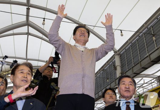 (성주=뉴스1) 이재명 기자 = 3차 경청투어에 나선 이재명 더불어민주당 대통령 후보가 9일 오후 경북 성주군 성주전통시장에서 연설을 하고 있다. 2025.5.9/뉴스1