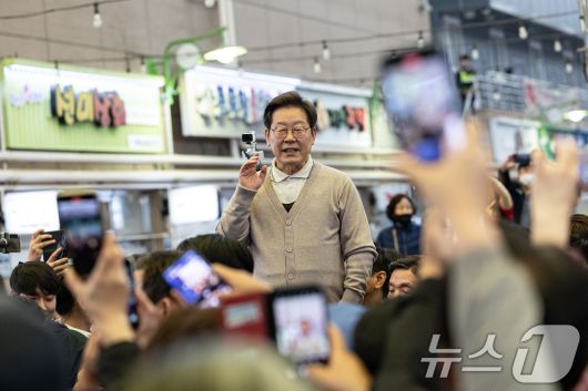(성주=뉴스1) 이재명 기자 = 3차 경청투어에 나선 이재명 더불어민주당 대통령 후보가 9일 오후 경북 성주군 성주전통시장에서 연설을 하고 있다. 2025.5.9/뉴스1