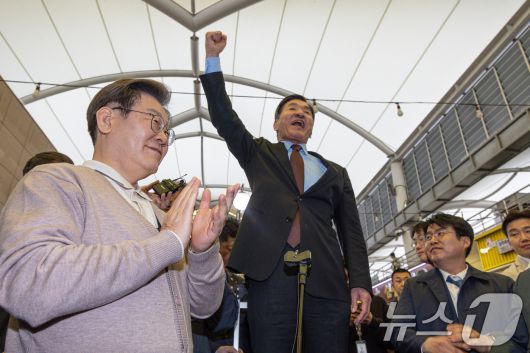 (성주=뉴스1) 이재명 기자 = 3차 경청투어에 나선 이재명 더불어민주당 대통령 후보가 9일 오후 경북 성주군 성주전통시장에서 관계자들의 발언을 들으며 박수를 치고 있다. 2025.5.9/뉴스12expulsion@news1.krCopyright ⓒ 뉴스1. All rights reserved. 무단 전재 및 재배포, AI학습 이용 금지.