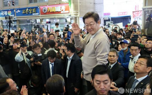 [성주=뉴스핌] 최지환 기자 = '골목골목 경청투어'에 나선 이재명 더불어민주당 대선후보가 9일 오후 경북 성주군 성주전통시장에서 시민들과 인사하고 있다. 2025.05.09 choipix16@newspim.com