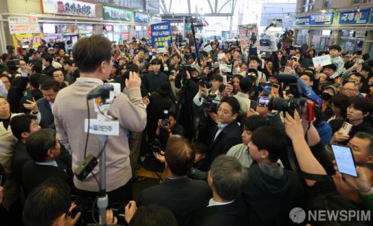 [성주=뉴스핌] 최지환 기자 = '골목골목 경청투어'에 나선 이재명 더불어민주당 대선후보가 9일 오후 경북 성주군 성주전통시장에서 즉흥연설을 하고 있다. 2025.05.09 choipix16@newspim.com