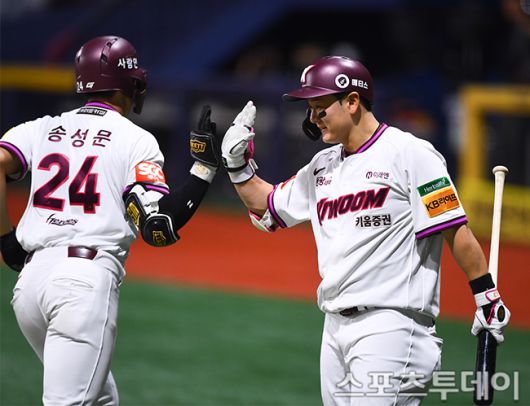 [스포츠투데이 팽현준 기자] 9일 서울 고척스카이돔에서 열린 2025 KBO리그 한화 이글스와 키움 히어로즈의 경기, 1회말 키움 최주환이 홈런을 터트린 송성문과 하이파이브를 하고 있다. 2025.05.09. [스포츠투데이 팽현준 기자 sports@stoo.com]
