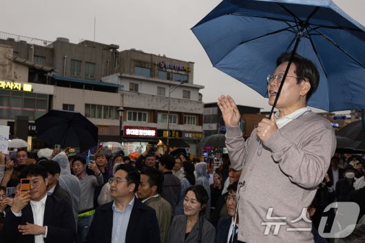 (고령=뉴스1) 이재명 기자 = 3차 경청투어에 나선 이재명 더불어민주당 대통령 후보가 9일 오후 경북 고령군 대가야광장에서 연설을 하고 있다. 2025.5.9/뉴스1