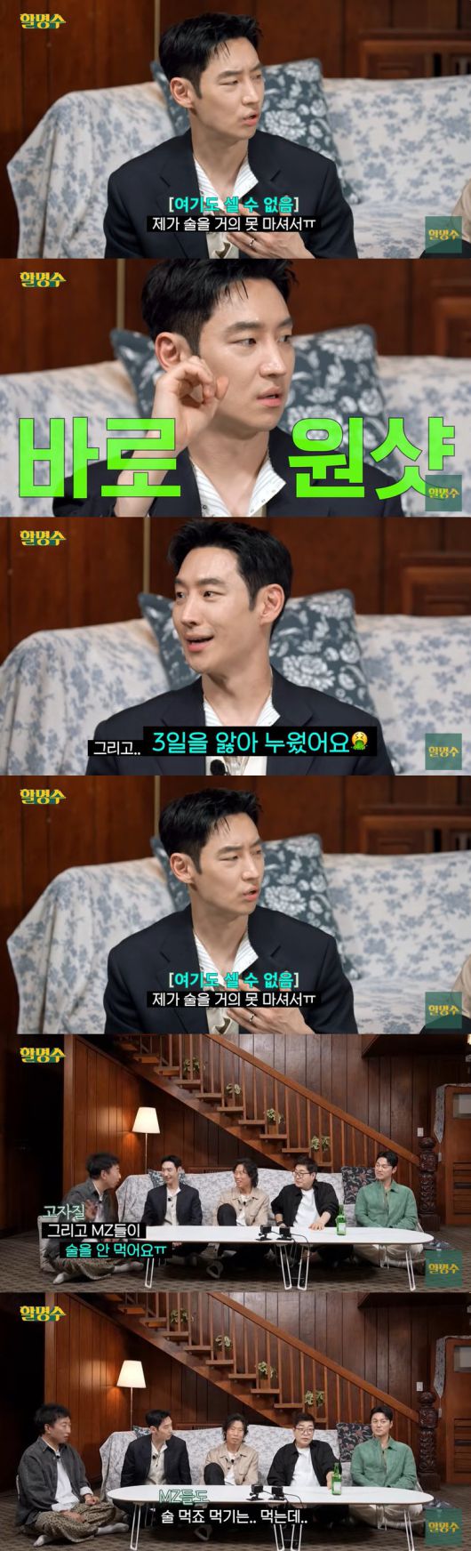 이후 박명수가 "MZ들이 술을 안 마신다"고 하자 이제훈과 유해진은 "맞다"며 폭풍 공감한 반면, 손현주는 "아니다. 먹긴 먹는데 구성원이 안 좋으니까 그러는 것"이라고 말해 폭소를 자아냈다.
