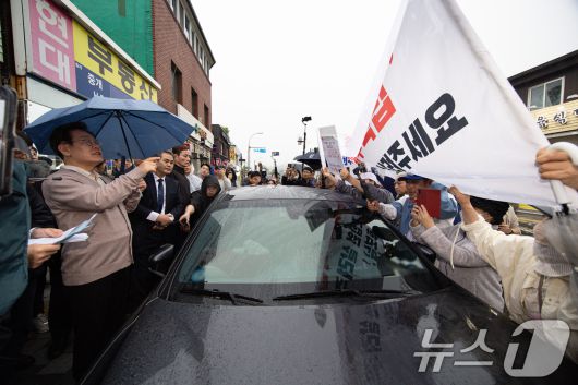 (고령=뉴스1) 이재명 기자 = 3차 경청투어에 나선 이재명 더불어민주당 대통령 후보가 9일 오후 경북 고령군 대가야광장에서 인근에서 민원을 청취하고 있다. 2025.5.9/뉴스12expulsion@news1.krCopyright ⓒ 뉴스1. All rights reserved. 무단 전재 및 재배포, AI학습 이용 금지.