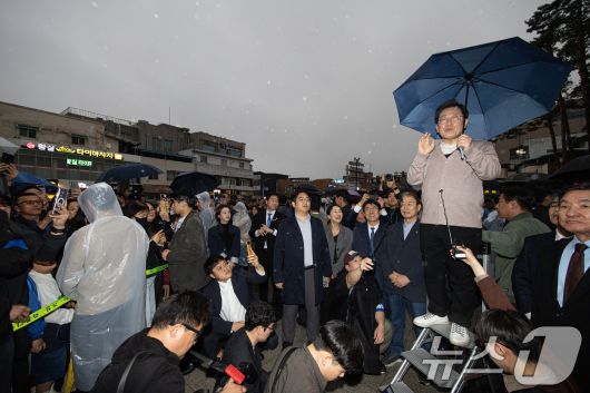 (고령=뉴스1) 이재명 기자 = 3차 경청투어에 나선 이재명 더불어민주당 대통령 후보가 9일 오후 경북 고령군 대가야광장에서 연설을 하고 있다. 2025.5.9/뉴스1