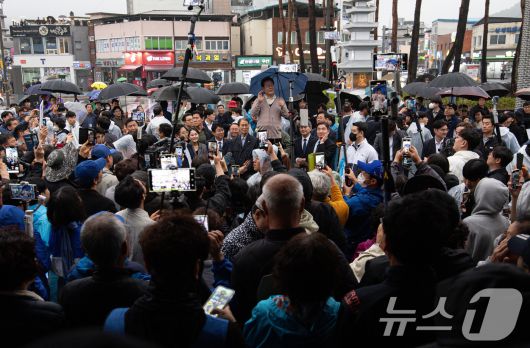 (고령=뉴스1) 이재명 기자 = 3차 경청투어에 나선 이재명 더불어민주당 대통령 후보가 9일 오후 경북 고령군 대가야광장에서 연설을 하고 있다. 2025.5.9/뉴스1