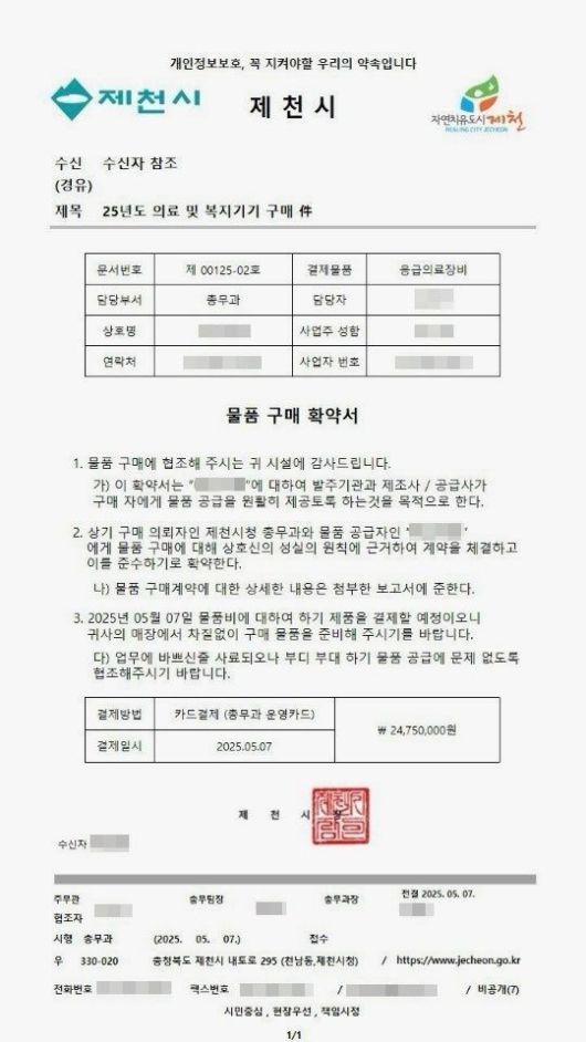 9일 제천시에 따르면 지난 7일 지역에서 유통업을 하는 A씨는 한 남성으로부터 "제천시청 공무원이다. 조달 물품 모델명을 불러줄 테니 찾아서 이를 공급해달라"는 전화 제안을 받았다. 이 남성은 제천시장 낙인이 찍힌 물품 구매 확약서를 사진으로 찍어 휴대전화 문자메시지와 이메일로 보내기도 했다.