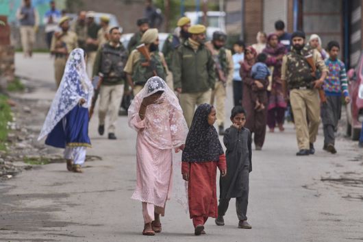 카슈미르 주민들이 경찰의 호위를 받으며 마을을 빠져나오고 있다. [AP = 연합뉴스] |