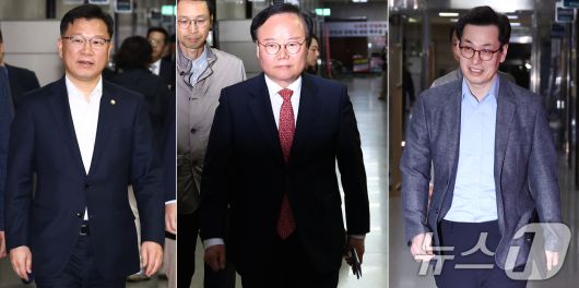 (서울=뉴스1) 김민지 기자 = 이양수 국민의힘 사무총장(왼쪽부터)과 김문수 후보 대리인인 김재원 비서실장, 한덕수 후보 대리인인 손영택 전 국무총리 비서실장이 9일 서울 여의도 국회에서 단일화 협상 회동을 하기 위해 이동하고 있다. 2025.5.9/뉴스1kimkim@news1.krCopyright ⓒ 뉴스1. All rights reserved. 무단 전재 및 재배포, AI학습 이용 금지.
