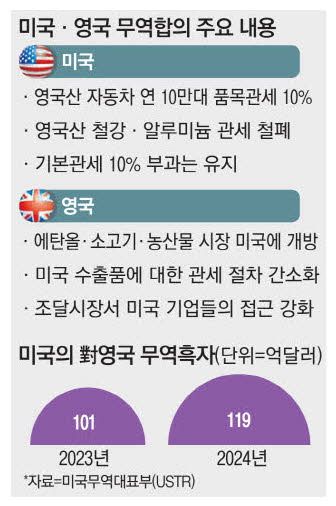 트럼프 대통령이 이날 백악관에서 직접 발표한 미·영 무역 합의는 영국이 소고기와 에탄올, 농산물 등 미국산 제품 수입을 촉진하는 대신에 미국은 영국산 제품에 대한 일부 관세를 낮춘다는 내용을 담고 있다.