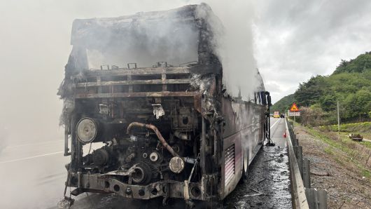 오늘(9일) 저녁 6시 10분쯤 충북 단양군 적성면 중앙고속도로 단양휴게소 인근을 부산 방향으로 달리던 고속버스에서 불이 났습니다.