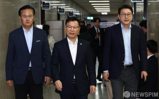 [서울=뉴스핌] 윤창빈 기자 = 이양수 국민의힘 사무총장(가운데)이 9일 오후 서울 여의도 국회에서 김문수 후보와 한덕수 예비후보 대리인단과의 단일화 협상 회동에 참석하고 있다. 2025.05.09 pangbin@newspim.com