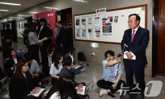 (서울=뉴스1) 김민지 기자 = 김문수 국민의힘 대통령 후보 대리인인 김재원 비서실장이 9일 서울 여의도 국회에서 열린 한덕수 무소속 대선 예비후보 대리인 측과의 단일화 협상 관련 회동을 마치고 브리핑을 하고 있다. 2025.5.9/뉴스1