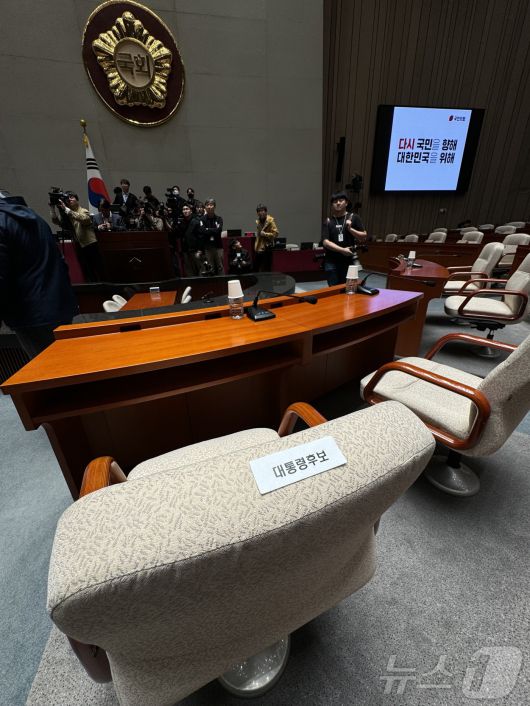 (서울=뉴스1) 안은나 기자 = 9일 서울 여의도 국회 국민의힘 의원총회장인 예결위회의장에 김문수 대통령 후보 자리를 알리는 스티커가 붙어있다. 2025.5.9/뉴스1coinlocker@news1.krCopyright ⓒ 뉴스1. All rights reserved. 무단 전재 및 재배포, AI학습 이용 금지.
