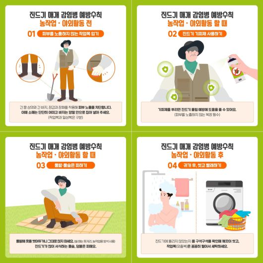 특히, 중장년층이나 면역력이 약한 노년층에서 감염률이 높으므로 농작업 등 야외 활동 이후 2주 이내 이런 증상이 나타나면 즉시 의료기관을 방문해 야외 활동 이력을 알리고 진료를 받아야 한다.