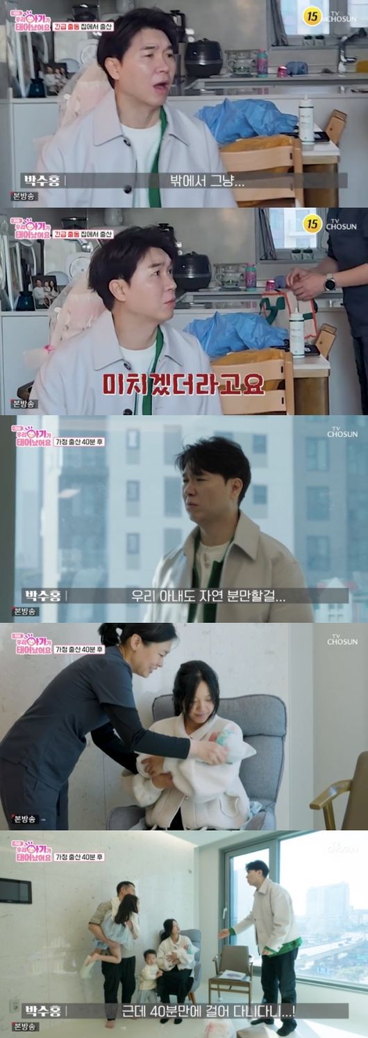 출산 후 40분 만에 멀쩡히 걸어 나온 산모를 본 박수홍은 “어떻게 이렇게 멀쩡할 수 있냐. 어떻게 출산한 산모가 예쁘냐. 우리 아내도 자연분만할걸. 우리 아내는 일주일을 넘게 입원했었다”라고 말했다.
