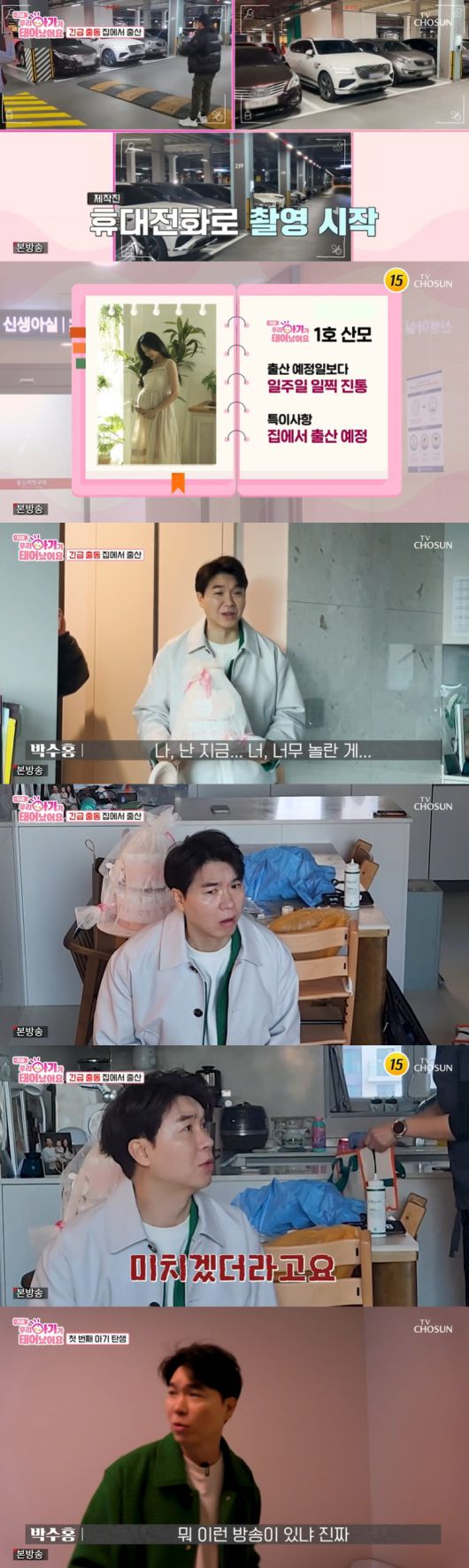 이날 박수홍은 새벽 6시에 걸려온 "지금 아기가 나온다"는 제작진의 전화에 "지금 새벽인데"라며 당황함을 감추지 못했다.