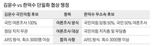 김 후보 측이 특정 정당에 대한 지지를 묻지 않고 일반 여론조사 100%로 해야 한다고 주장한 반면, 한 후보 측은 기존의 국민의힘 경선 방식대로 실시하자고 맞섰다.