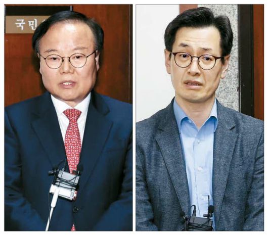 밤늦도록 협상 나선 김문수·한덕수 대리인 9일 오후 8시 30분부터 국회에서 진행된 단일화 재협상이 결렬된 뒤 김문수 국민의힘 대선 후보 대리인인 김재원 비서실장(왼쪽)과 한덕수 무소속 후보 대리인인 손영택 전 국무총리 비서실장이 각각 브리핑을 하고 있다. 뉴스1 |