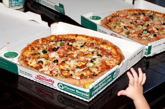 비트코인 1만개짜리 파파존스 피자 두 판. 전설이 된 이 피자를 향해 아기가 뻗은 작은 손이 보인다. /Laszlo Hanyecz |