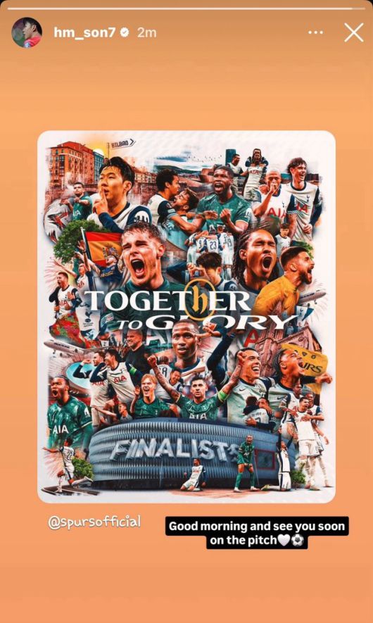 손흥민도 무관 탈출을 고대하고 있다. 토트넘 소식통 '토트넘 홋스퍼 뉴스'는 '토트넘이 손흥민 없이 UEL 결승에 진출하자 손흥민이 반응했다'라는 기사를 게재했다. 매체는 "토트넘은 보되/글림트전 승리 후 SNS에 '우리는 빌바오로 간다!'라는 메시지를 올렸다. 이에 주장 손흥민은 게시글에 '좋아요'를 누르며 반응했다"라고 전했다.