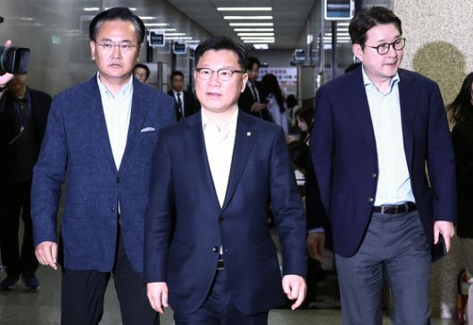 이양수 국민의힘 사무총장이 9일 서울 여의도 국회에서 김문수 후보와 한덕수 예비후보 대리인단과의 단일화 협상 회동에 참석하고 있다. 왼쪽부터 단일화 추진 본부장인 유상범 의원, 이 사무총장, 신동욱 수석대변인. 뉴스1 |
