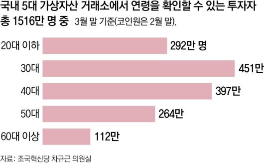 2030세대가 기존 부동산과 주식, 예·적금 등 재테크 수단에 한계를 느끼고 가상자산 투자에 뛰어들면서 해당 시장은 급격하게 성장했다. 국회 기획재정위원회 소속 차규근 조국혁신당 의원실에 따르면 올 2월 말 기준 국내 5대 가상자산 거래소(업비트, 빗썸, 코인원, 코빗, 고팍스)에 가입한 총회원 수는 1629만 명(중복 합산)이다. 연령별로 보면 △30대 451만 명 △40대 397만 명 △20대 이하 292만 명 △50대 264만 명 △60대 이상 112만 명이다.
