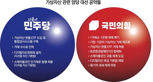 6월 조기 대통령 선거를 앞두고 1600만 명이 넘는 가상자산 투자자들의 표심을 잡기 위한 정치권의 경쟁이 치열하다. 더불어민주당은 가상자산 현물 상장지수펀드(ETF) 도입을 공약으로 내놨고, 국민의힘은 ‘1거래소-1은행 원칙’을 없애겠다고 약속했다. 양당이 꺼내든 공약들이 대선 이후에 현실화될 수 있을지 업계의 관심이 집중된 가운데 기대와 우려가 엇갈리고 있다.》